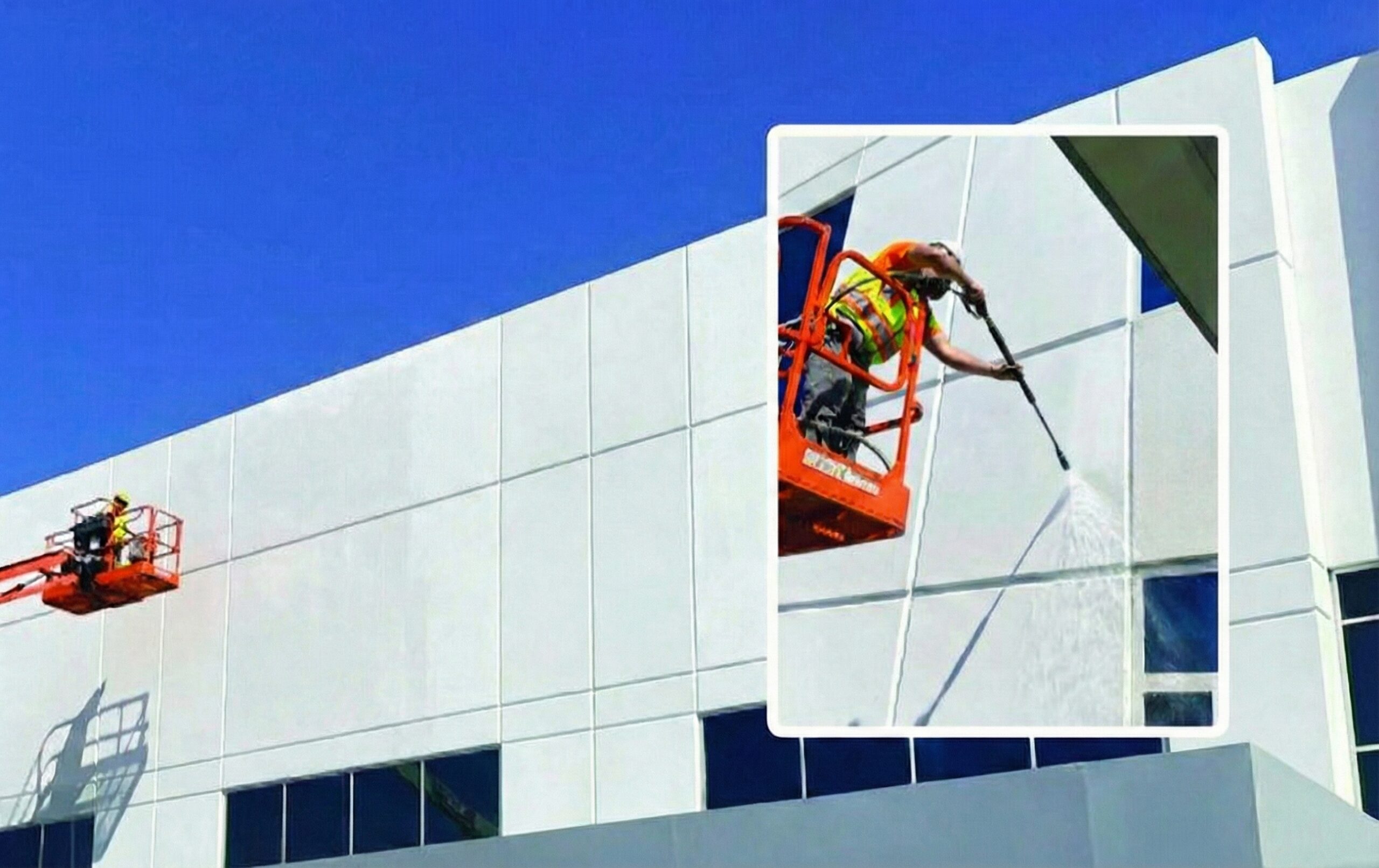 Professional building and window washing enhances appearance with spotless, gleaming results.